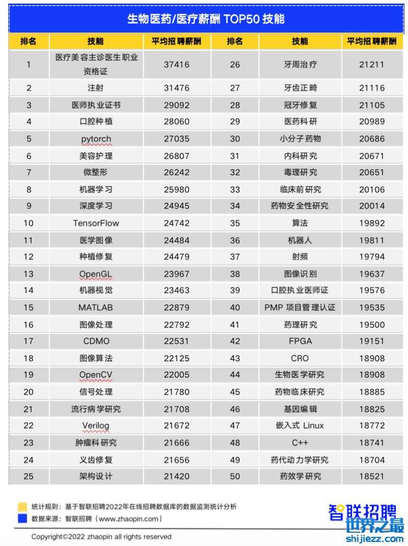近年来,大众消费水平提升驱动医美行业快速发展,需求的快速增长带动医美相关行业薪酬水平攀升。此外,大众对口腔健康也愈加重视,齿科服务需求持续处于高位,口腔种植、种植修复、义齿修复、牙周治疗、牙周正畸等牙科相关的技能,排在薪酬榜前列。此外,pytorch、机器学习、深度学习、TensorFlow、医学图像等数字化技能,收入也十分可观,反映了行业向数字化转型方向发展。(北京时间财经 向雨)