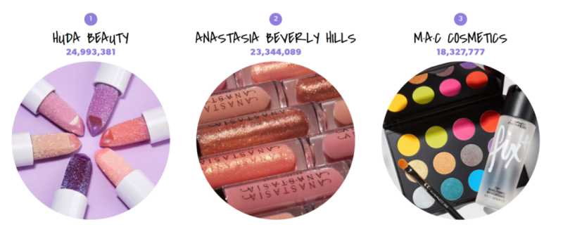 实际上,话题标签量最多的前三个品牌与报告里整体排名前三的品牌(Huda Beauty,Anastasia Beverly Hills和MAC Cosmetics)完全一致。