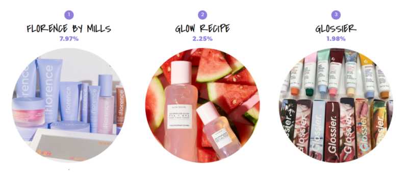 在社媒上,参与度最高的品牌TOP3则换了新面貌,分别是美妆品牌Florence by Mills、护肤品牌Glow Recipe和Glossier。