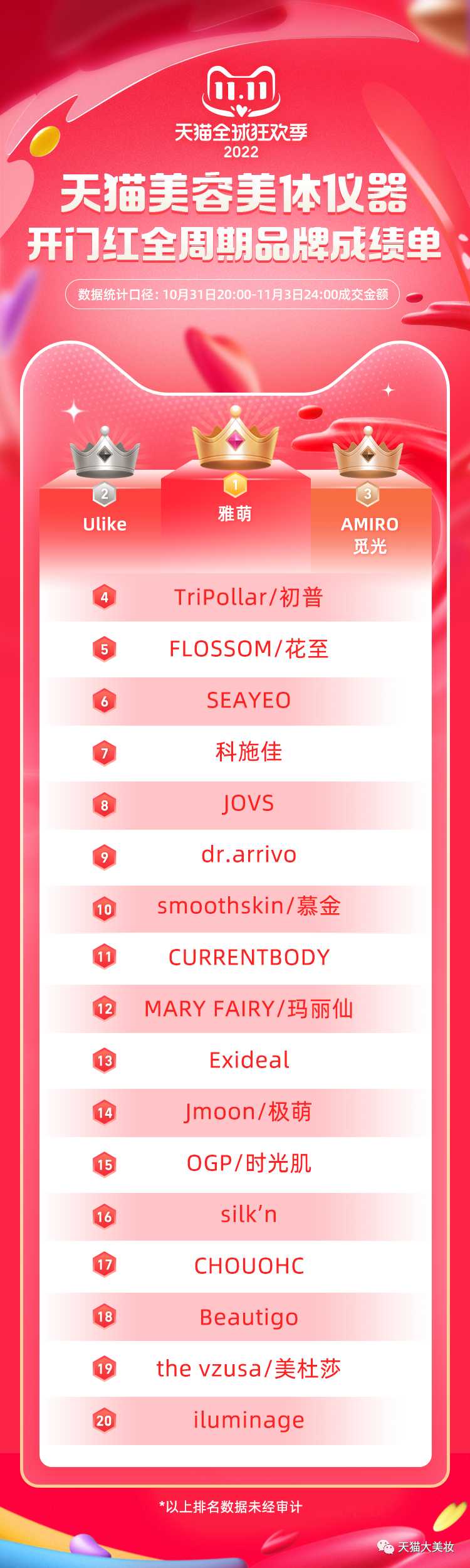 而来自市场端的反馈则强有力地印证了医研共创的成功:今年双11期间,雅萌ACE五代射频仪单品销量突破6亿元,并登上了天猫美妆双11爆款单品榜NO.3。