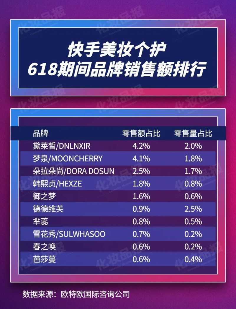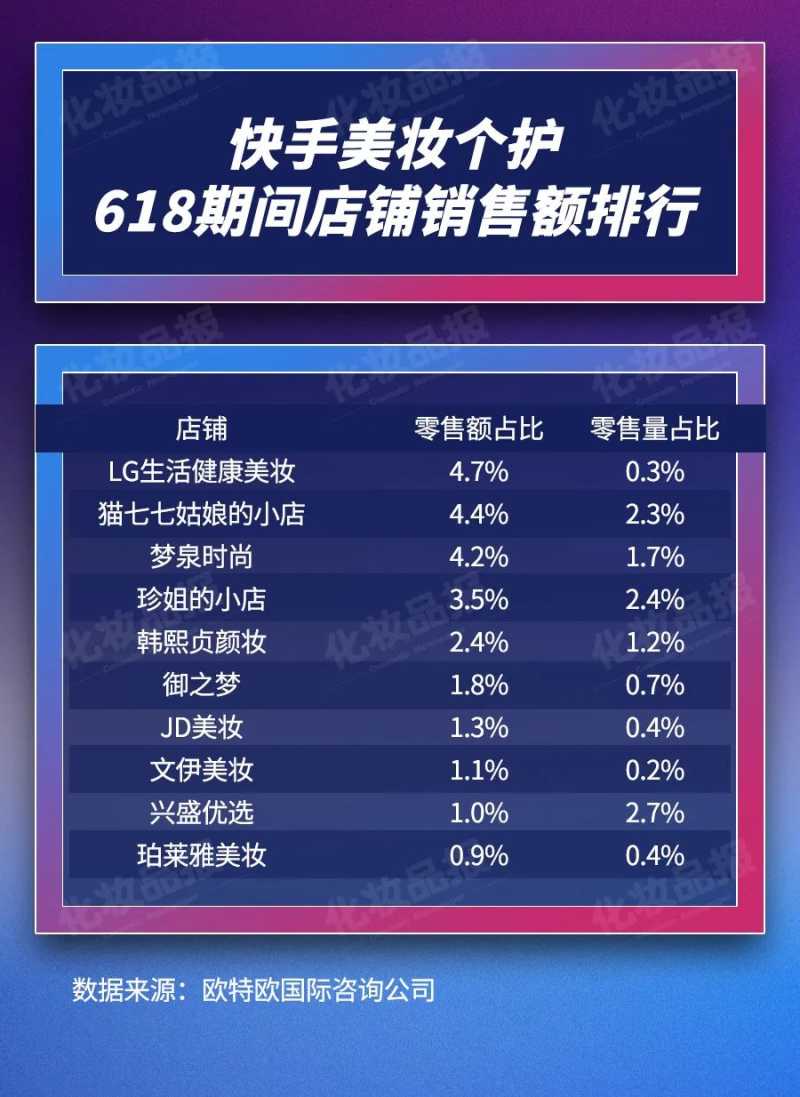 在快手美妆个护店铺销售额排行榜上,618期间,LG生活健康美妆排在首位,珀莱雅美妆店铺进入了前十。