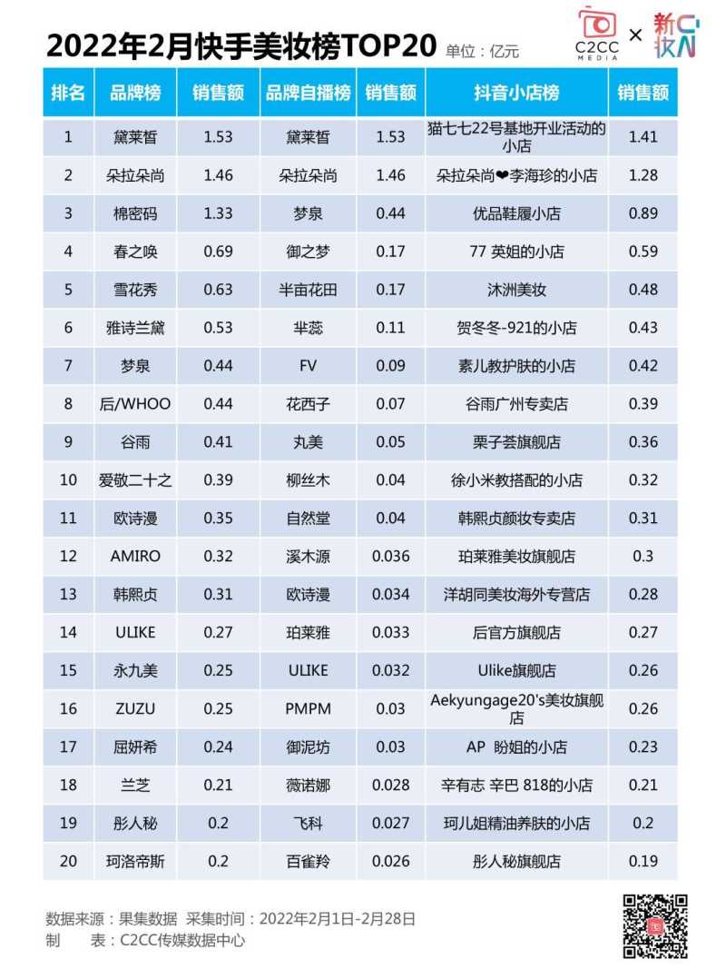 1-2月快手美妆20强中,销售额排名前三的是朵拉朵尚(GMV2.37亿元)、黛莱皙(2.24亿元)、棉密码(1.33亿元)。