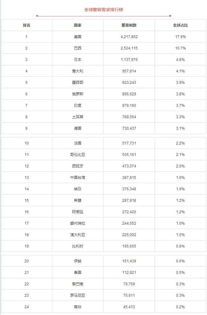 全球整形美容需求排行榜单!中国只有台湾需求较旺