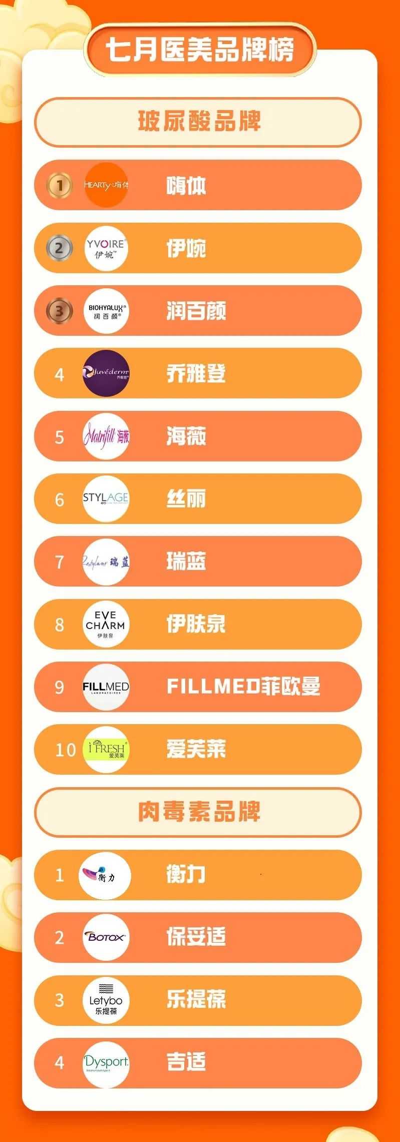 总得来说,虽然榜单排名有所变化,但入榜品牌与往月榜单入选品牌并无很大变化。同医美项目格局一样,玻尿酸品牌亦呈现维稳局面,短时间或难出现“黑马”。
