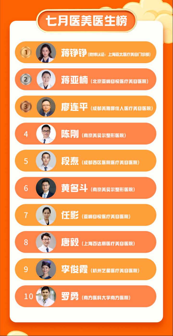此外,其他上榜医美医生并不陌生,例如成都美雅娜佳人医疗美容医院廖连平、南京美贝尔整形医院陈刚、成都西区医院段焘都是榜单里的“老熟人”。