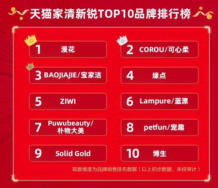 而家清TOP10榜单,纸品维达、洁柔、清风、心相印位列前四, 蓝月亮、威露士、奥妙紧随其后。