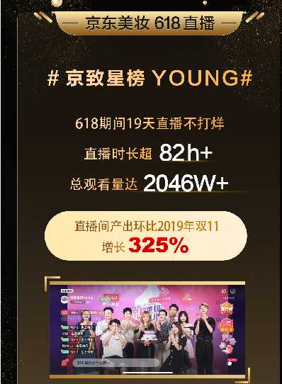 “京致星榜YOUN”618期间19天直播不打烊,直播时长超82小时,总观看量超2046万,直播间产出环比2019年双11增长325%。“京东买手”618期间美妆全员直播日均2场,观看量超达200万。此外,明星直播中,朱一龙、许光汉、吴宣仪、张天爱、任嘉伦等15位明星降临直播间,总计在线观看人数超百万。