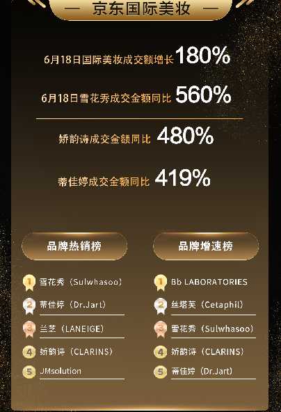6月1日,京东国际美妆迎开门红,全天成交额同比增长300%。6月18日,国际美妆成交额增长180%,雪花秀、娇韵诗、蒂佳婷成交额同比分别增长560%、480%、419%。在热销品牌中,雪花秀、蒂佳婷、兰芝、娇韵诗、JMsolution跻身品牌热销榜TOP5。日系品牌Bb LABORATORIES成增速最快的品牌。