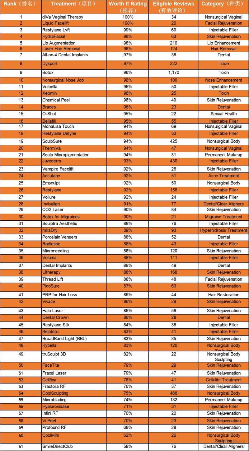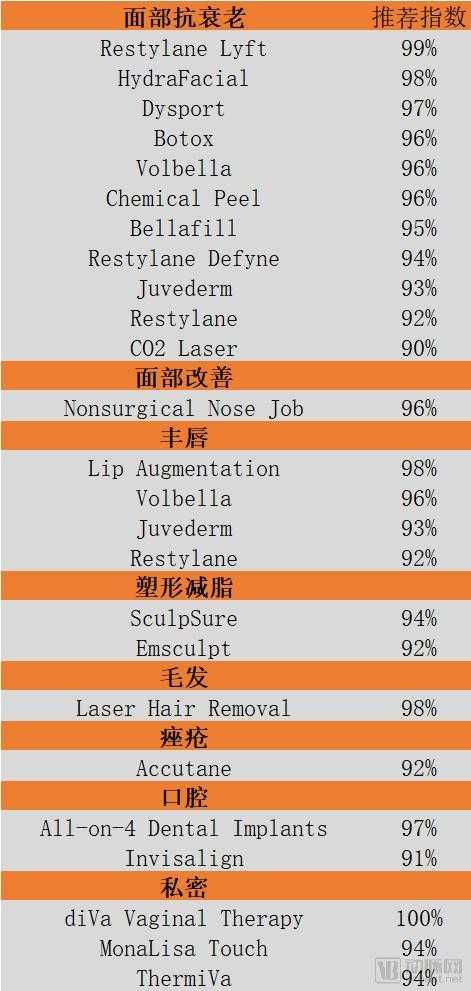 2、第二种是护肤品企业主导的无创的医美项目,和其它医美治疗手段相比,舒适度很高,几乎不痛,比如医疗级健康护肤疗程Hydrafacial,全球每15秒就有一人使用海菲秀疗程,2017年超过2,000,000 次治疗,在美国的疗程次数已超越肉毒杆菌。在2019年Realself的项目推荐指数中,高达98%,排名第二。同样的道理,卖成品,标准体系很容易建立起来,也可以与其他认证的诊所一起,增加渠道接触的范围。