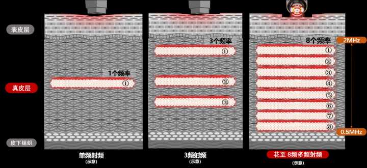 首先,射频是国际公认、有效的抗衰核心技术。射频是可以作用在真皮层,真皮层位于表皮下面,厚度大概为2mm,这个深度几乎是所有护肤品都不能作用到的范围,这就是为什么你用再多的抗衰护肤品都没用的原因,不仅吸收率低而且作用层面浅。