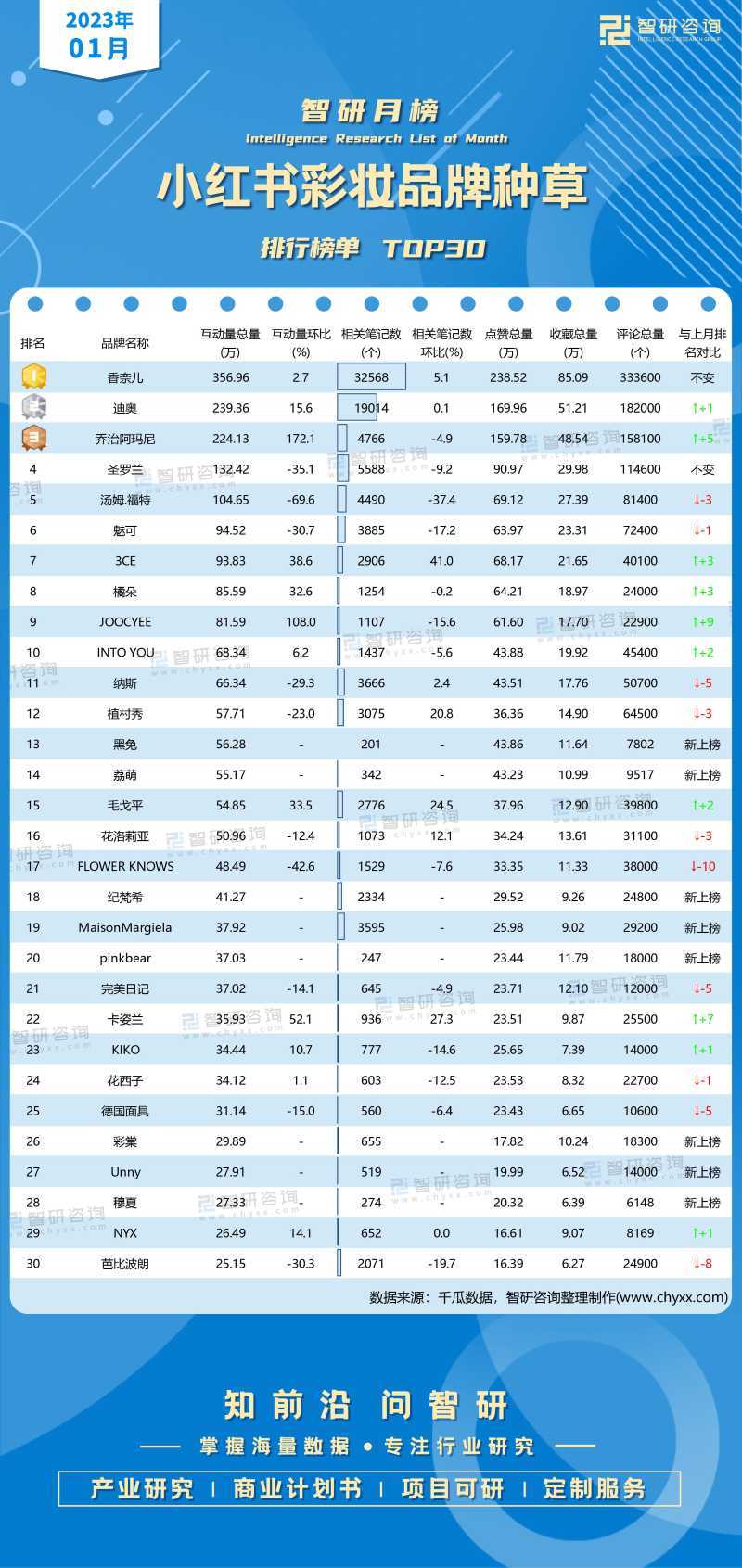 2023年1月小红书彩妆品牌种草排行榜(附月榜TOP30详单)