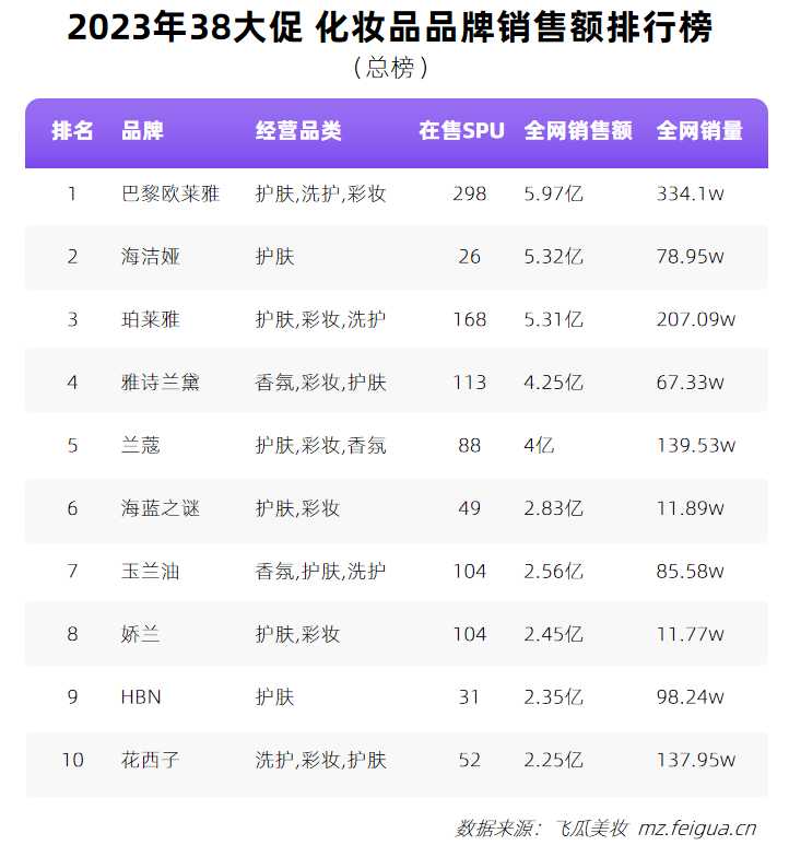“她经济”的持续升温已成为各个消费赛道的热门话题。在经济生活不断满足的现在,“她经济”除了高消费实力,还展现出“悦己”、“精细化”等特性。根据飞瓜美妆品牌排行榜显示,2023年38大促期间,巴黎欧莱雅以5.97亿的销售额拿下美妆全网TOP1。