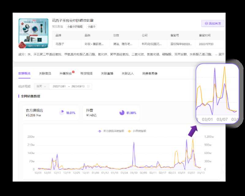 我们从飞瓜美妆产品库中可以了解到,“小黛伞”妆前防晒以抖音作为主要销售阵地,带货GMV占比超过80%。从产品聚合销售趋势来看,抖音销售额在38大促期间呈现明显增长趋势,成为此次营销活动真正的爆款产品。