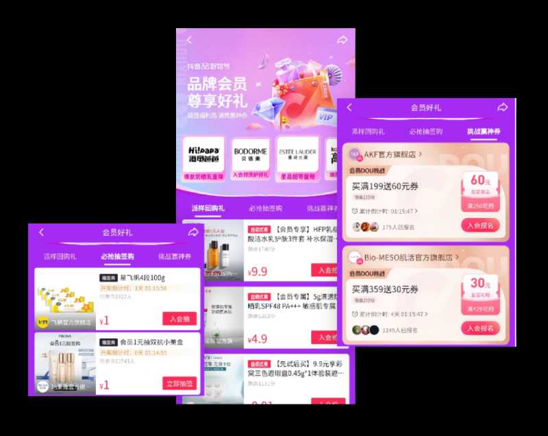 此外,主会场38活动也着重结合了品牌会员,在首页以“大牌小样试用”率先吸引用户兴趣。各大品牌除了在banner为露出外,还可参与“挑战迎神券”获得专属大额优惠。商城公域与品牌会员的结合将潜在客源以低门槛的试用价格吸引至私域运营,提高了未来的转化可能。