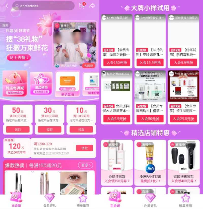 随着抖音电商逐步拉进与消费者之间的距离,在本次38大促期间,抖音商城承载了消费链路上的主要场景,成为本次活动的重点营销场域。
