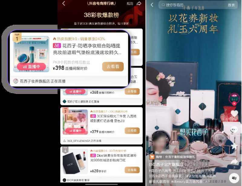 在平台流量的加持下,多个品牌营销活动在本次38好物节期间获得更高效的曝光。比如,「花西子」在节日促销的同时,搭配品牌6周年庆典上线“花养新妆”主题活动。其中热卖产品“小黛伞”妆前防晒以妆前防晒隔离三合一的实用功效,登上38彩妆爆款榜TOP1。
