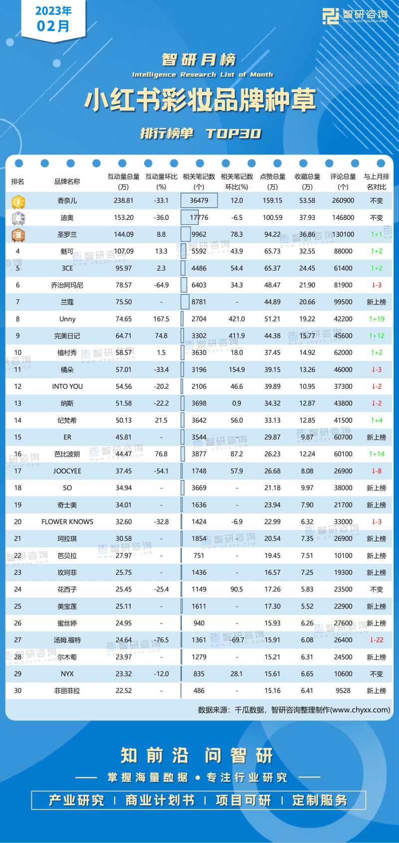 2023年2月小红书彩妆品牌种草排行榜(附月榜TOP30详单)