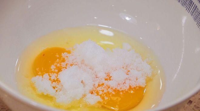 1、 碗中打入两个鸡蛋,往里面加入20g白糖,用打蛋器打散,等白糖全部融化就可以了。