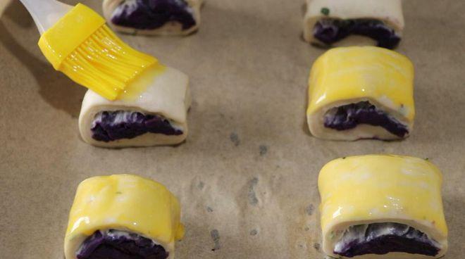 8、 注意观察紫薯卷的颜色,颜色发黄就可以出炉了。