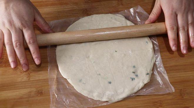 4、 手抓饼撕掉表面的薄膜,将它们叠放在一起,用擀面杖擀薄,制成一个长方形的饼状。
