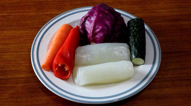 3、 粉皮可以用水冲洗一下表面,再切成细条状摆放在蔬菜们的中心位置。