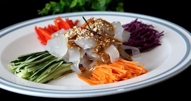 粉皮,紫甘蓝,黄瓜,红椒,胡萝卜,大蒜,花生碎,芝麻。