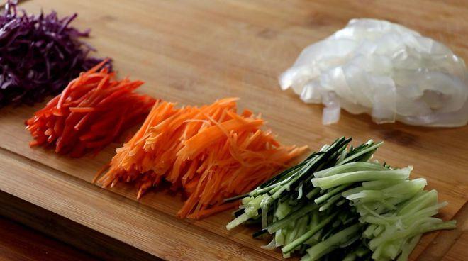2、 分别将紫甘蓝、红椒、胡萝卜、黄瓜洗净切成丝状,尽量切得细一点,切好以后摆放在盘子的四周。