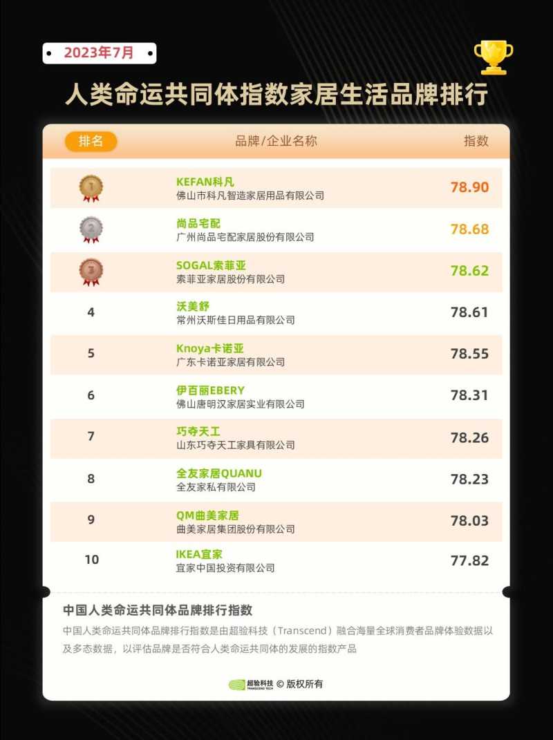 超验:人类命运共同体指数家居生活品牌排行-2023年7月