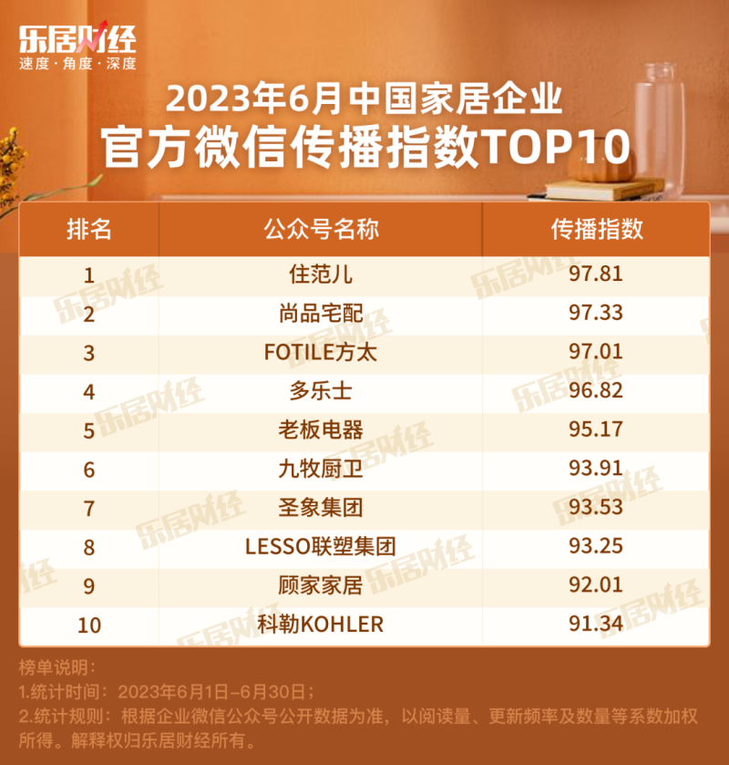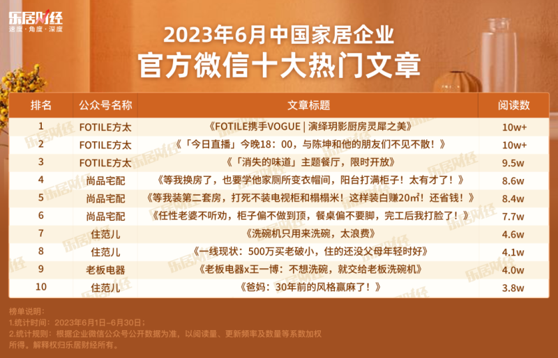 2023年7月,乐居财经发布《中国家居企业官方微信影响力月度排行榜》。在本期出炉的6月份榜单中,上榜30家企业公众号6月份共推送文章561篇,总阅读量约179万。本期榜单,乐居财经共收集60家在6月份有更新的家居微信号作为样本,并根据账号的多项公开数据,包括文章推送频次、总发文数量、总阅读量,以及单篇文章的爆文指数等系数加权所得。尚品宅配位列榜首,月内推出多篇阅读量极高的爆款文章,传播力不容小觑。排名第二的住范儿保持了较高的更新频次,几乎做到了工作日每日更新,且多篇阅读量达到数万。老板电器以推送频次及文章点赞数量取胜,本月排名第三。内容方面,家居企业以装修技巧、设计美图等吸流稿件为主,厨卫家电的黑科技应用展示,以及依托明星做的品牌营销报道等内容也获得较高关注。