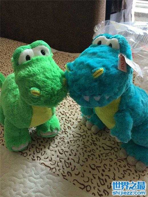 这个毛绒玩具十大品牌排行榜上的恐龙,外观给我的映像就像是一只会怕兔子的大灰狼一样,不要看他把白花花的牙齿露在外面,它可爱的大眼睛还是把它的蠢萌出卖了,很可爱,做工方面也很精细,正常使用是不会掉毛的。