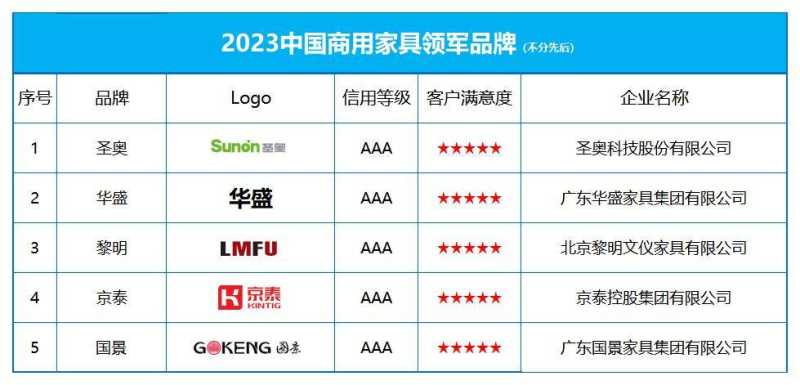 近日,招投标供应链品牌推介平台联合多家权威媒体发布“2023中国商用家具领军品牌”榜单。圣奥、华盛、黎明、京泰、国景等品牌凭借其注重智能化、绿色环保、定制化、多场景化、设计创新等优势从众多知名品牌中脱颖而出,成为中国商用家具行业高质量发展引领者。
