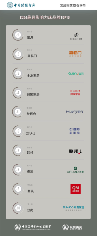 2024最具影响力床品牌TOP10:慕思、喜临门、全友、顾家位居前列