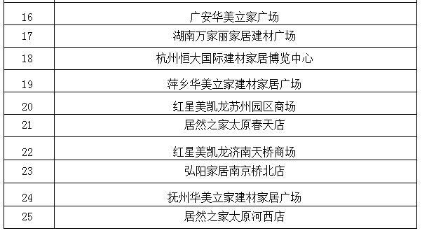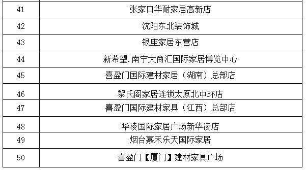 50家卖场中,来自全国连锁和区域连锁的总计有27家,占总量的54%,分别是:喜盈门6家,红星5家,居然5家,大明宫3家,月星2家,欧亚达1家;值得关注的是,以开拓四、五线城市为主的华美立家,有5家卖场入围,说明四五线城市有着巨大的消费潜力。
