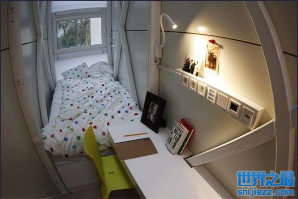在二楼的位置有一个单人床,单人床的旁边有一个窗户,采光非常好,可以经常打开窗户通风。在床的旁边有一个书桌,并且床头的设计还能够置物。如果一个人在这个房子里居住的确是绰绰有余,并且会非常的舒适,由于面积小,这个房子被称之为世界上最小的豪宅。