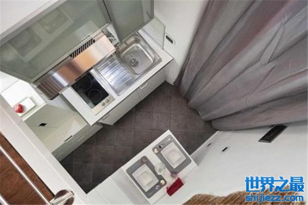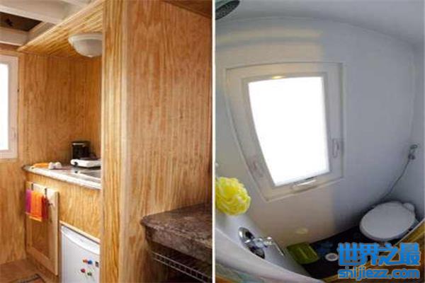 首先说房子里面的楼梯能够自由收放,节省了很大的空间,并且将楼梯向上推就能够看到,房间一楼有卫生间,卫生间里面能够上厕所也能够洗澡,非常的方便,在旁边有一个小小的区域,就是厨房,在里面能够摆放一台冰箱。