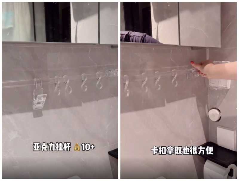 这个十来块的挂杆也很好用,它利用粘贴式的卡扣进行安装,搭配一些挂钩和夹子,可以起到不错的收纳作用,无论是用在卫生间、阳台,还是书桌前,都很合适。