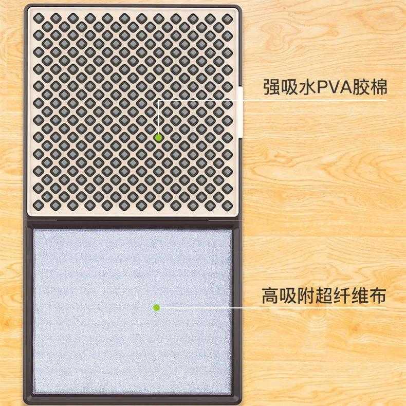 一半是PVA胶棉,可清洁鞋底泥污,加入消毒水还能顺带消毒,另一半为纤维布,可擦掉水和灰尘,干爽进家门。地垫底部有防滑设计,不易移。