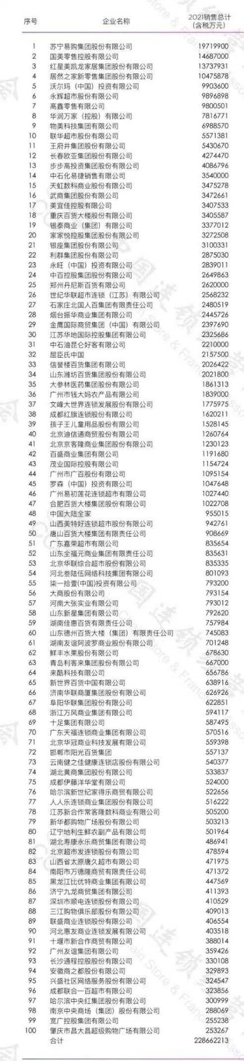 下附CCFA发布的2021年中国连锁TOP100完整榜单: