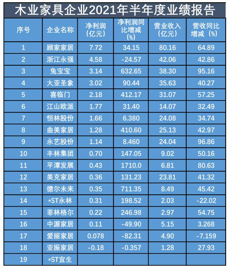今年上半年,木业家具企业整体呈现向上趋势,业内企业竞争依然激烈,业绩排名出现较大变化。新京报记者近日盘点18家木业家具企业2021年半年度报告显示,顾家家居营收80.16亿元位居首位,亚振家居营收1.28亿元成为垫底企业。平潭发展、德尔未来和兔宝宝净利润增速超过500%。