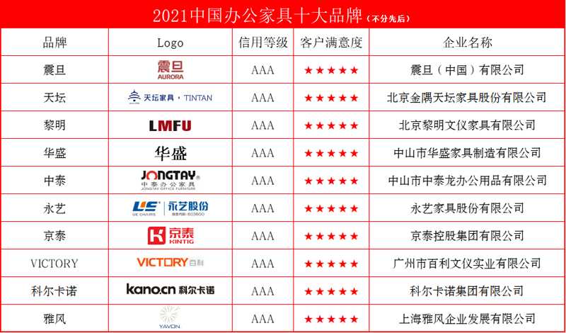 招投标供应链品牌推介平台为推动办公家具企业加强品牌建设,提升品牌的知名度和美誉度,扩大办公家具品牌在招投标市场和消费市场的影响力,特举办了“2021中国办公及商用家具评价推介”活动,据悉,此活动受到业内及社会各界人士的广泛关注和热情参与,参评展示家具知名品牌企业510余家,网络公众满意度市场调查投票共达829.3262万余票。各参评企业数据由机构推荐、企业自荐、大数据采集构成,并由来自质检、环保、认证、行业协会等专家对各参评品牌企业进行了综合评审,“震旦”、“天坛”、“黎明”、“华盛”、“中泰”、“永艺”、“百利”、“京泰”、“科尔卡诺”、“雅风”等品牌凭借优异的综合实力在众知名品牌中脱颖而出斩获“2021中国办公家具十大品牌”供应商,展现了企业良好品牌形象,充分发挥品牌引领作用,引领行业向更健康、更环保、更生态方向发展。具体如下: