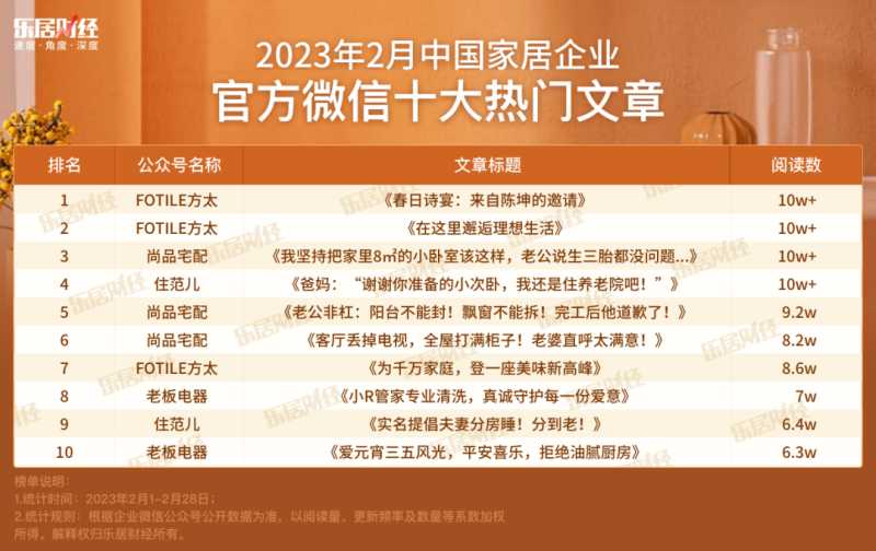 2023年3月,乐居财经发布《中国家居企业官方微信影响力月度排行榜》。在本期出炉的2月份榜单中,上榜30家企业公众号1月份共推送文章553篇,总阅读量约201万。