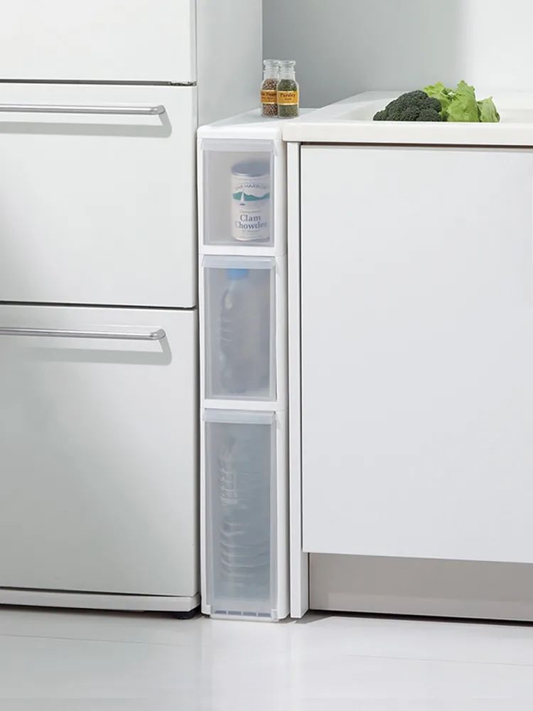 而这款缝隙柜是抽屉式设计,拿取东西十分的方便,而且外观也更加的统一并且不会落灰。
