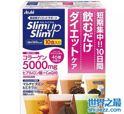 朝日Asahi旗下的SlimUpSlim瘦身营养冲剂,在日本COSME大赏2014排行榜上榜上有名,是日本销量最好的一款减肥代餐,喝下后马上有饱腹感,味道也很好。加入了胶原蛋白、玻尿酸等美白护肤成分,多种维他命、矿物质、食物纤维等46种人体所需营养成分。