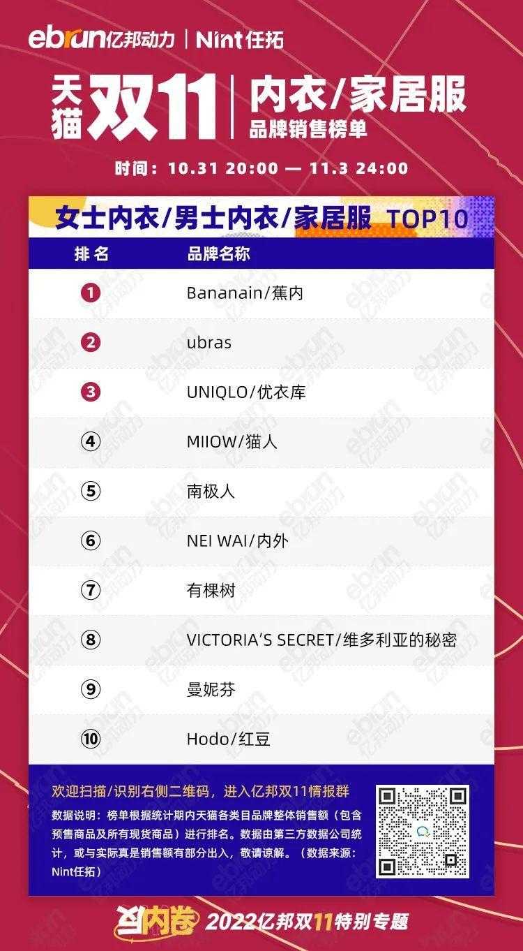 内衣/家居服品类,蕉内超越Ubras登上榜首,优衣库位居第三,猫人、南极人、内外和有棵树位居TOP 4-7,维多利亚的秘密上榜,并暂居第八。销售额方面 ,TOP 10整体销售额较去年同期增长了近20%,其中,蕉内的销售额较去年上涨了超过1倍。