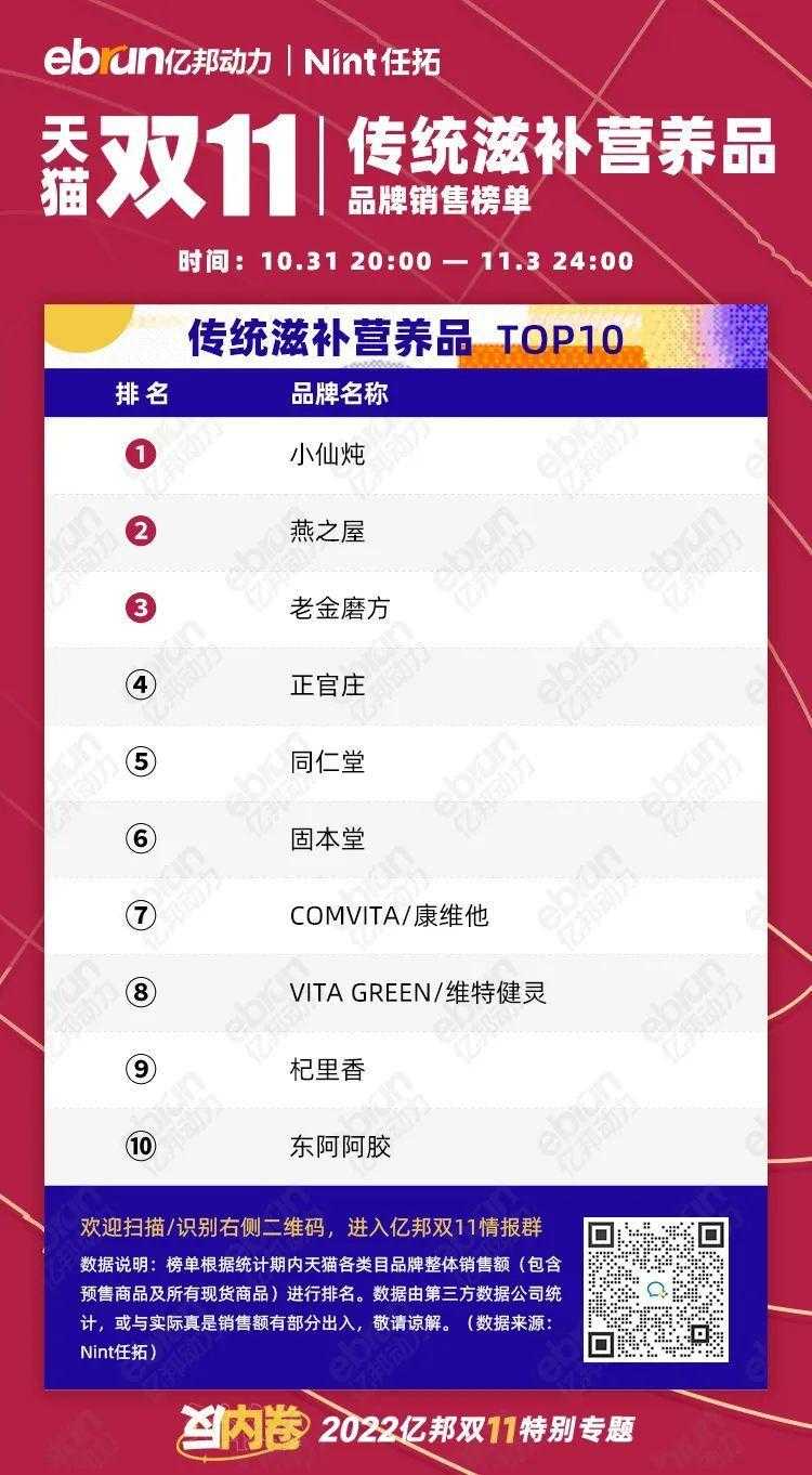传统滋补营养品类的整体销售额下滑的情况更为严重,TOP 10品牌总销售额整体下降了约59%,小仙炖、燕之屋依旧排名TOP 1-2,老金磨方上榜并升至第三,去年同期排名第四的肌活从榜单中消失。
