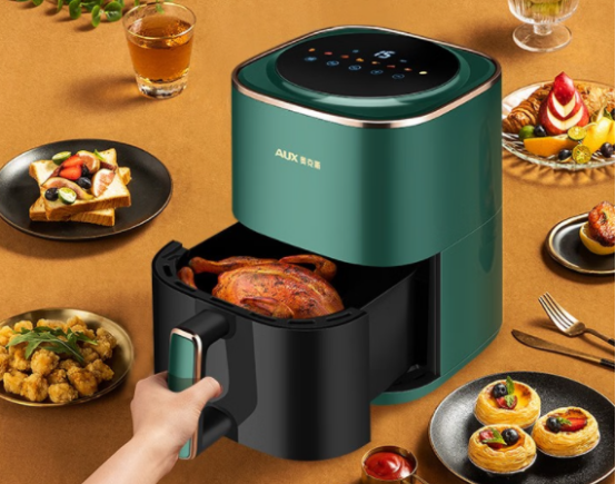 奥克斯是一家国产品牌,也在空气炸锅排行前十名之列。他们推出的空气炸锅采用高温空气循环代替热油来加热和脆化食物,从而降低食物的油脂摄入量。此外,这款空气炸锅的配件相当齐全,包括主机、炸篮、滤油架和说明书等,并配备了一体式把手和后置散热孔。