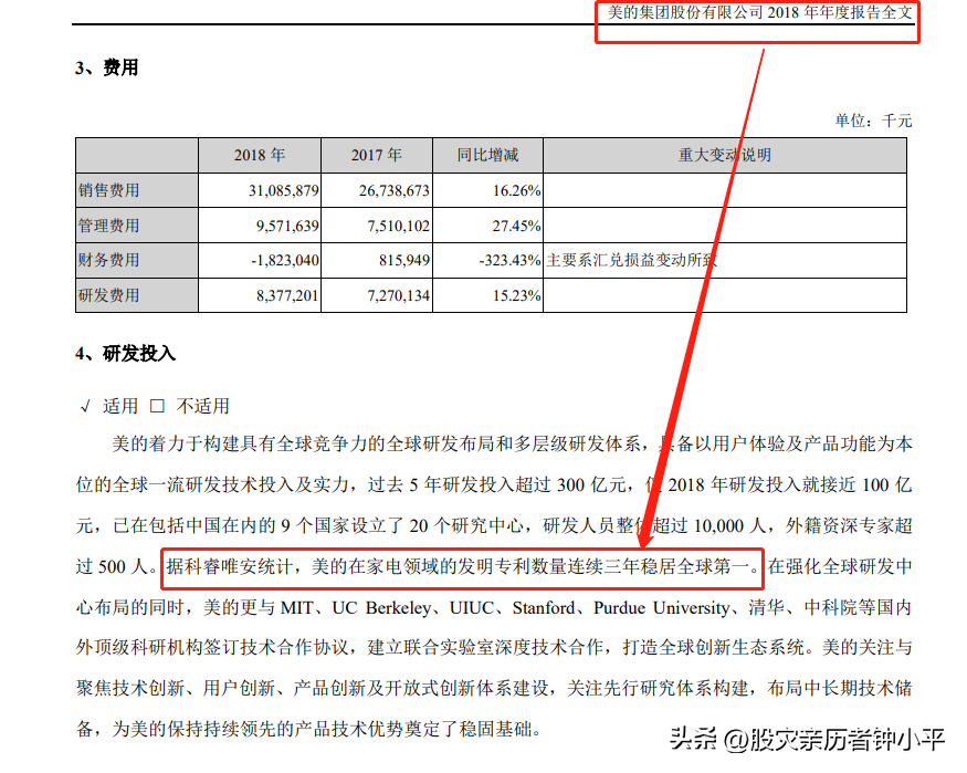 通过这事,让我想起美的集团曾经宣传自己的发明专利数量在家电领域全球第一的事情。美的这话是在公司2018年报中说的: