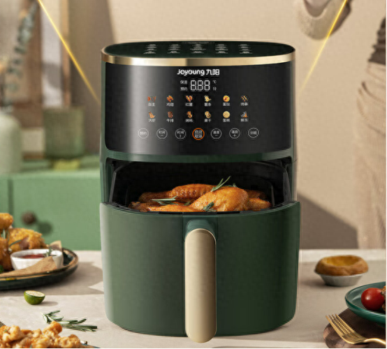 九阳是源自山东的品牌,也入围了空气炸锅排行榜前十名。他们的这款空气炸锅外观设计不错,复古绿色搭配金色边框,整体给人大气而有质感的印象。前面设有电子触控彩屏,操作相对便捷。这款空气炸锅的配件非常齐全,包括主机、炸篮、滤油架、说明书等,并搭载了一体式把手以及后置的散热孔。