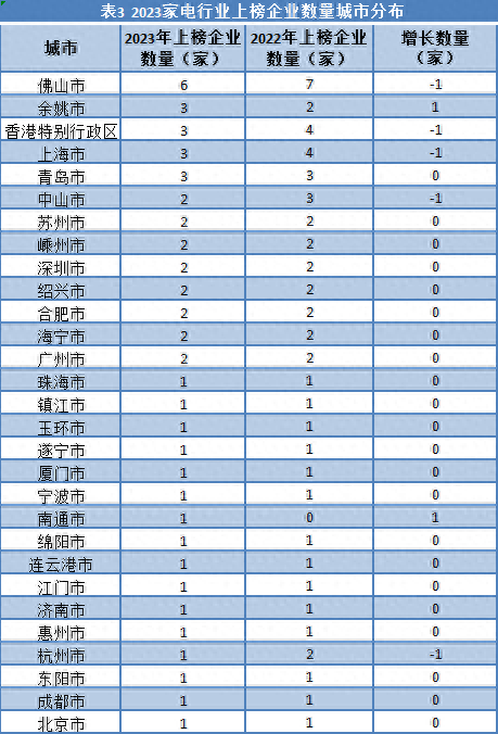 从上榜企业数量的分布来看,企业主要集中在沿海地区,尤其是在广东和浙江两个省份,两者总和已超过行业上榜总数的一半。其中,广东的佛山位居第一,上榜企业数量共有6家。