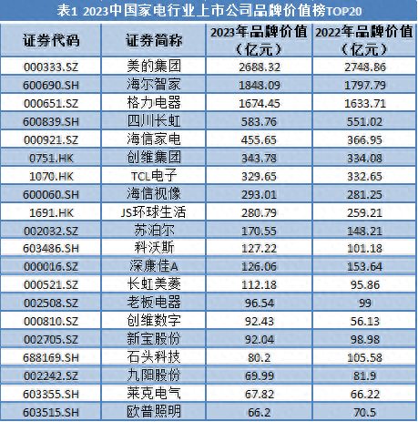 “2023中国家电行业上市公司品牌价值榜TOP20”(以下简称TOP20)是家电行业品牌价值靠前的20家中国上市公司。其中,美的集团、海尔智家和格力电器位居前三,品牌价值分别为2688.32亿元、1848.09亿元和1674.45亿元。